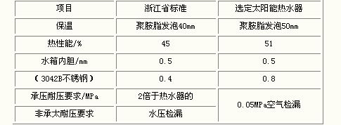 經多方比較后,確定選用帶臥式副水箱全自動型產品(坡屋頂式)。該型號適用于坡屋頂,克服了現有技術各種太陽能熱水器重心高,在坡屋頂上安裝困難等缺點,安全可靠、外形平整,成片安裝整潔美觀。安裝貯水箱位置由建筑專業做相應處理。表1為該產品與浙江省家用太陽能熱水器地方標準的比較情況,表2為該產品性能參數。